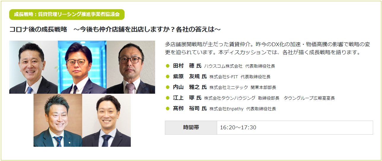11月12日(火)、明治記念館で開催される日管協フォーラム2024において、当社代表の髙栁がセミナー「コロナ後の成長戦略 ~今後も仲介店舗を出店しますか?各社の答えは~」のファシリテーターを務めました。